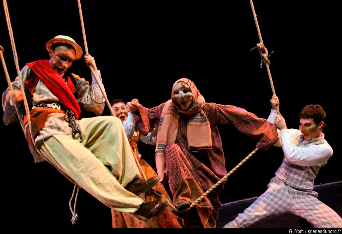 L’absence de décor ne manque à aucun moment, les lumières, les costumes et les musiciens/comédiens faisant tout le travail, avec beauté et humour. Ces derniers forment la réelle valeur ajoutée de la pièce. Et le jeu talentueux avec les masques en bois, donne une ampleur et une intensité fantastiques aux mouvements et aux acteurs qui en deviennent burlesques.